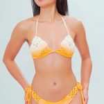 Crafted using traditional macrame techniques, each intricate knot and weave is expertly woven by skilled artisans, creating a unique and eye-catching design that sets this swimwear apart. The gradient effect seamlessly transitions from vibrant orange at the top to crisp white at the bottom, mirroring the subtle shifts of color as the sun dips below the horizon.