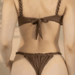 A rich cacao-brown bikini adorned with hand-braided straps and golden shells, inspired by tropical elegance. A signature piece from our new PALMAH Collection.