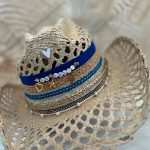 Our Be Happy Holes Hat Blue is adorned with vibrant blue decorations, echoing the serenity of the sky and the depths of the ocean. These stunning hues are meticulously woven into the hat’s classic cowbow shape, creating a captivating design that is both cheerful and unique.