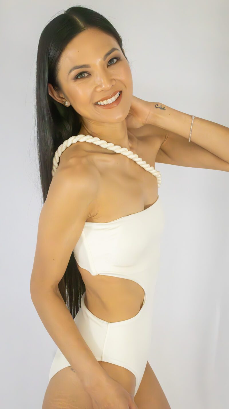 A sleek ivory one-piece with a braided asymmetrical strap and soft side cut-outs. Minimal, elegant, and part of our PALMAH Collection.