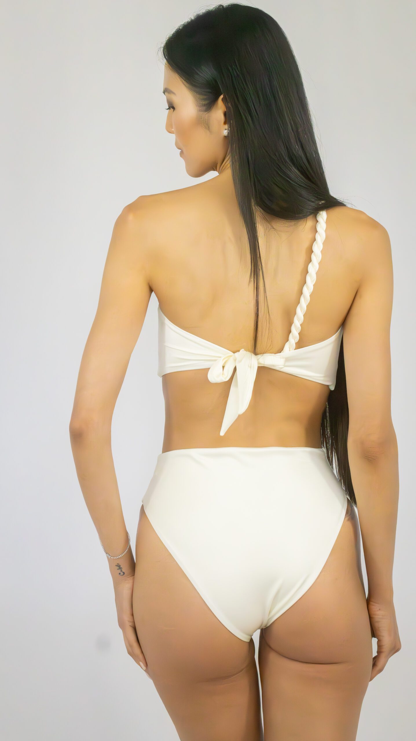 A sleek ivory one-piece with a braided asymmetrical strap and soft side cut-outs. Minimal, elegant, and part of our PALMAH Collection.
